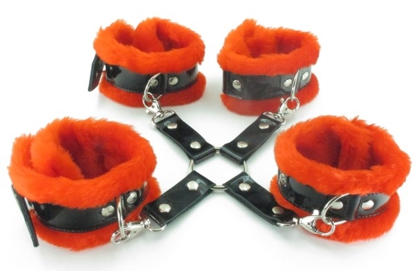 Выпол­нены наруч­ники и нанож­ники из иску­ствен­ного меха в страст­ном крас­ном цвете с чер­ными лако­выми рем­нями. Иде­альны для самых страст­ных и "жар­ких" ласк, т.к. не остав­ляют сса­дин и царапин на запя­стьях. Застеги­ваются при помощи ремешка и регу­ли­руются на любой размер